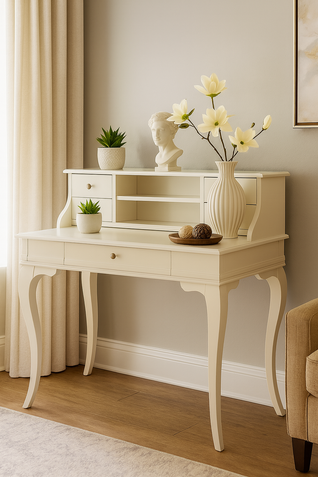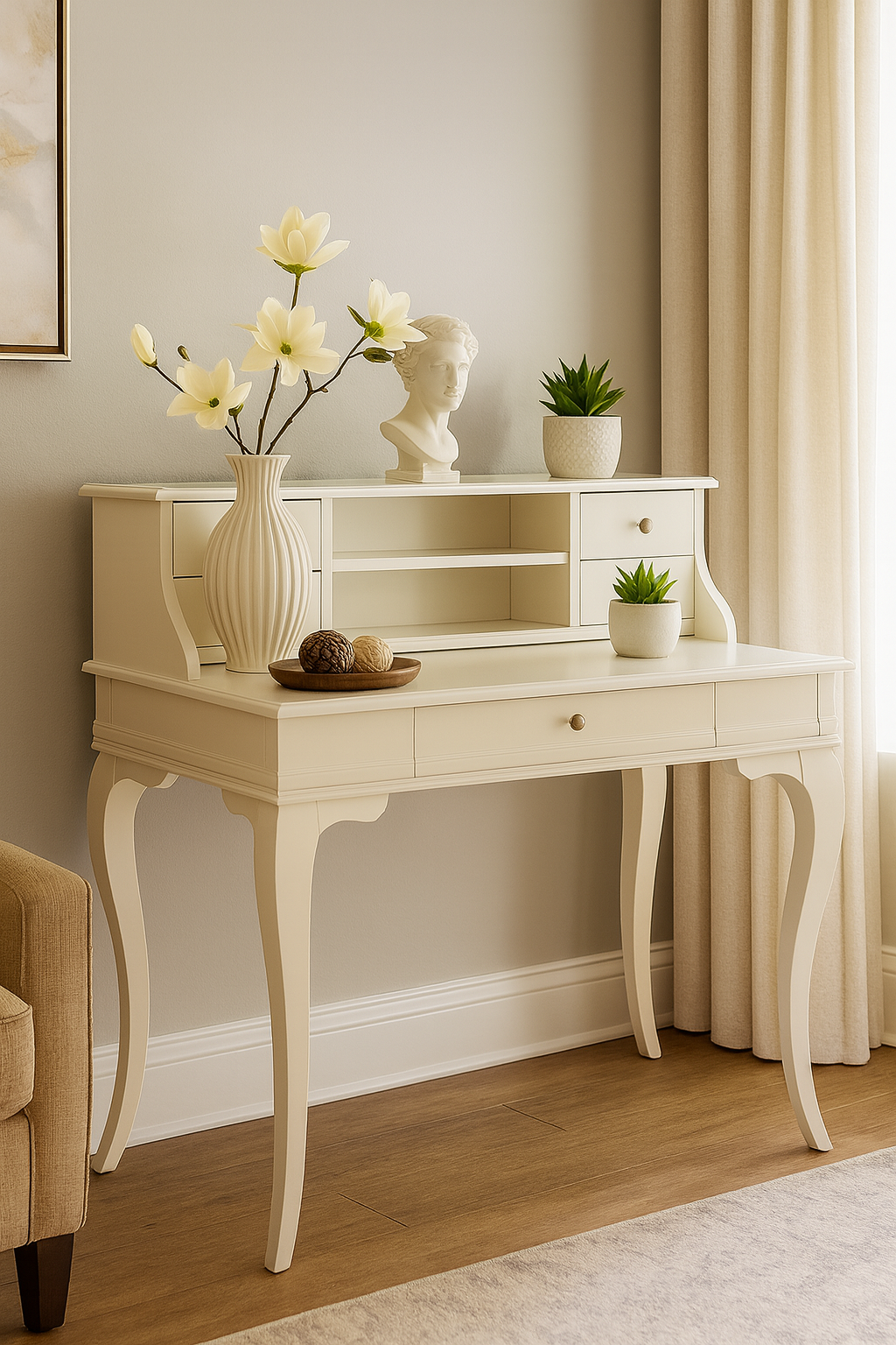 Wooding Mobilya 110 Cm 5 Çekmeceli Masif Krem Raflı Çalışma Masası